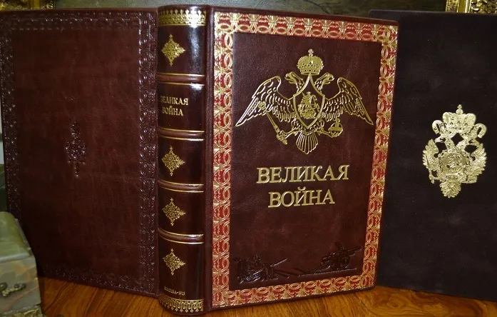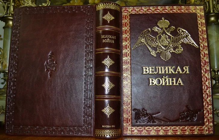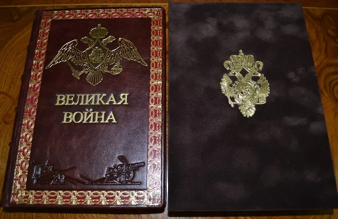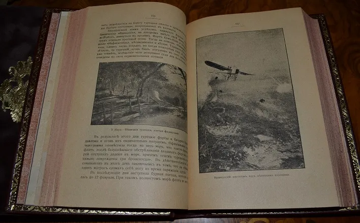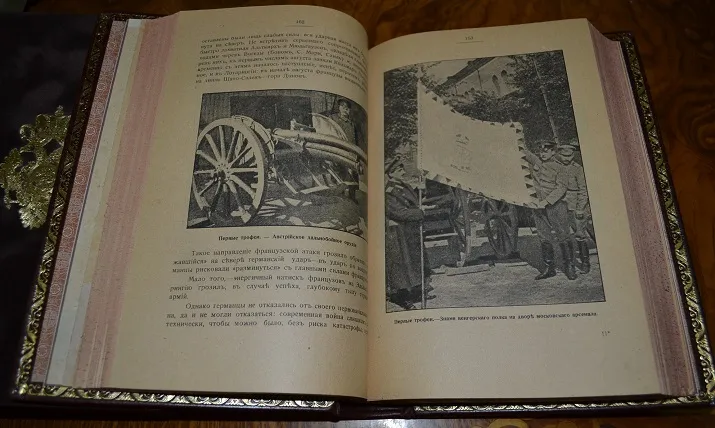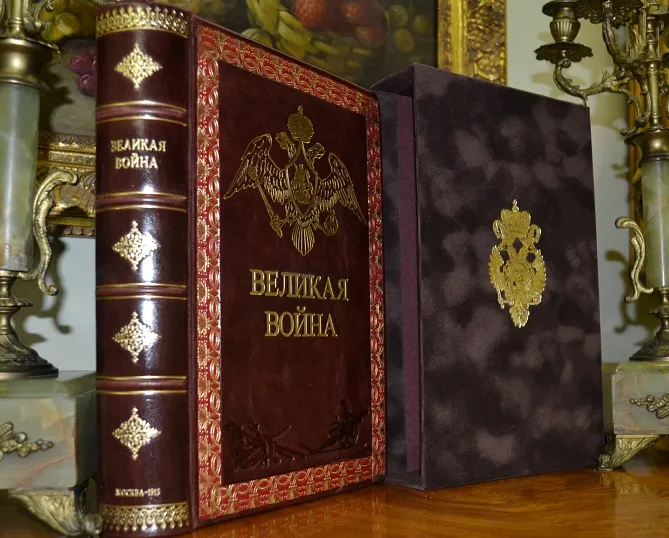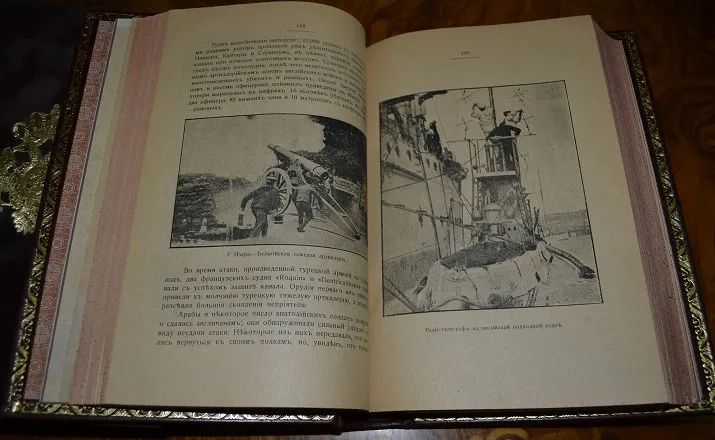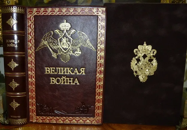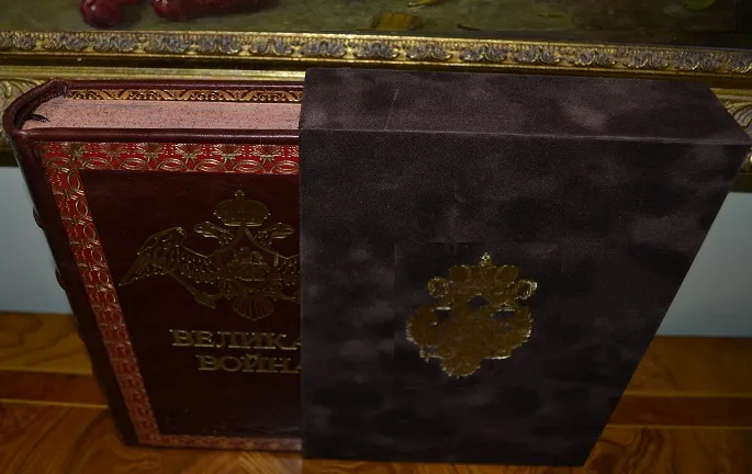 Сохранность - очень хорошая! Редкий коллекционный экземпляр с сохранением издат. обложки! В роскошном цельном кожаном переплете /высококачественная переплетная кожа, художественное офорление, ручная работа/, богатое золотое и цветное тиснение, орнаментальное украшения и пр., и в бархатом стилизованном футляре с золотым тиснением герба России! Увелич. формат: 27 х 18см., 328с.+241с.+160с., цветные составные форзацы с гербами, золотая дублюра, тоновый обрез блока, шелковое ляссе. В издании представлены многочисленные иллюстрации /на каждой стр.!/, фототипии, портреты, рисунки, схемы, планы, карты, табл. и пр.! Полный комплект! Коллекционная редкость!