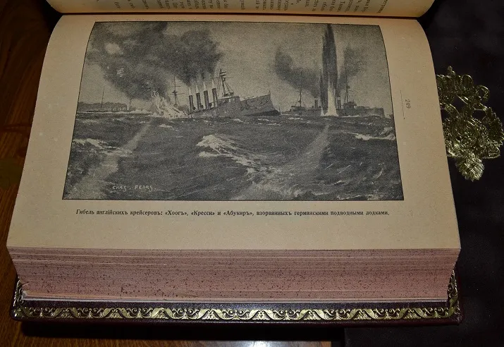 Отдельно описана война на море - известные морские сражения, победы и поражения. Военно-морской флот представлен описанием флотов - России, Германии, Великобритании, Турции, Японии, Франции и пр. Подробно рассмотрены морские сражения, выделены имена морских офицеров и военачальников, описана боевая мощь флота- военные корабли, эскадренные броненосцы, линкоры, крейсеры, подводные лодки, морская авиация и пр., вооружение ВМФ, новые разновидности их и применения, противолодочные средства, минное оружие, использование химического оружия и мн. др.
