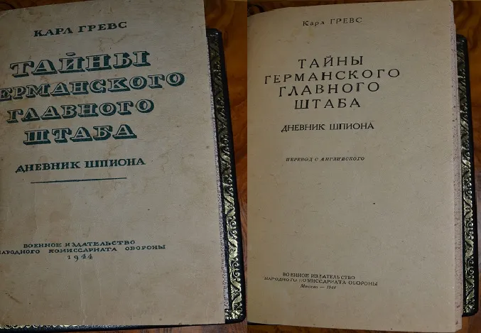 2. Вторая работа сборника: Карл Гревс "Тайны германского главного штаба" (Дневник шпиона) - прижизненное издание на русском языке 1944г. - редкие мемуары-воспоминания известного разведчика. Автор Карл Гревс, двенадцать лет состоял на службе немецкой разведки - одной из самых лучших разведок мира! Во время выполнения очередного задания в Англии, Грэвс был разоблачен и арестован. В тюремной камере он написал эту книгу "Дневник шпиона", увидевшую свет в июне 1914 года.