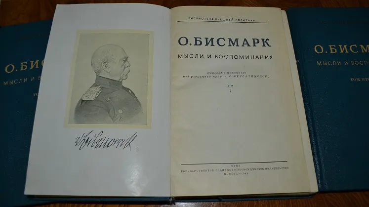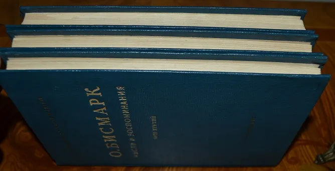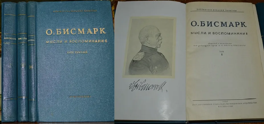 Издание 1940-1941года, по праву считается один из самый полных и точных переводов! Русский перевод Мыслей и воспоминаний Отто фон Бисмарка сверен по немецкому изданию: Otto Furst von Bismarck, Gedanken und Erinnerungen, Neue Ausgabe, Erster Band, Stuttgart und Berlin, 1924. Примечания составили В.В.Альтман и В. Д.Вейс. В редактировании русского перевода первого тома Мыслей и воспоминаний Бисмарка и примечаний к нему принимали участие доцент МИФЛИ Б.Г.Вебер и Э.И.Теумин. Перевод с немецкого под редакцией профессора А.С.Иерусалимского!