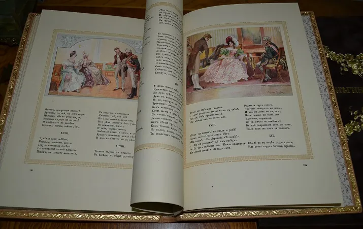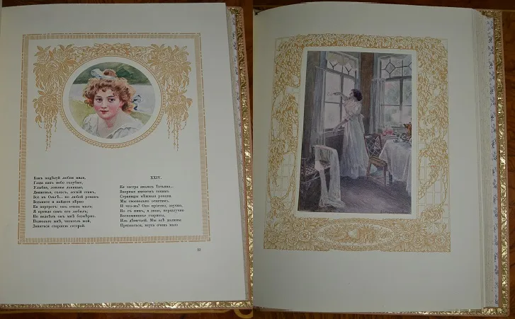 Редко встречающееся коллекционное издание, числится во многих "Каталогах редких книг" - прекрасно иллюстрированно: хромолитографированный титульный лист работы русского художника А.Лео., все страницы текста заключены в изысканные цветные рамки и украшены гравированными аллегорическими заставками и виньетками. Восемнадцать рисунков в тексте и девять отдельных страничных иллюстраций выполнены выдающей русской художницей, живописцем и графиком - Е.П.Самокиш-Судковской, по праву считаются лучшими иллюстрациями к "Евгению Онегину" за всю историю его издания!