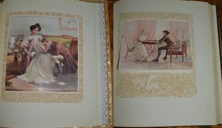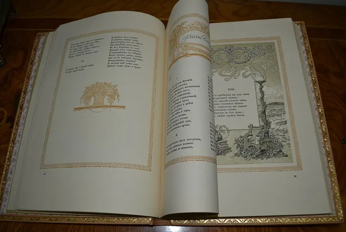 Четвертое издание, по праву считается лучшим/!/ из всех ранее выходившим, большой формат, красочная полиграфия, богато украшено художниками и иллюстраторами - изысканные цветные картины-акварели художницы Е.П.Самокиш-Судковской были выполнены отдельно, и вклеены на плотные листы украшенные расписными орнаментальными рамками! Все картины Самокиш-Судковской выполнены в стиле "салонного реализма", по своему замыслу их можно назвать "театрально–постановочными", изысканными и очень красочными! Иллюстрации Е.П.Самокиш–Судковской проникнуты "пушкинским временем", романтично–идеализированным, сентиментальным настроением. В них проявилась авторская интерпретация пушкинского произведения, личностное понимание текста и образного ряда. На творчество художницы оказали влияние чешский модерн и живопись Альфонса Мухи. Страницы текста украшены гравированными заставками, виньетками, рамками, заключающими в себе разные символические детали – "аллегории искусств, любви и смерти". Е.П.Самокиш-Судковская использовала орнаментальные мотивы, что проявилось в обилии причудливых и роскошных гирлянд, украшающих заставки и концовки книги!