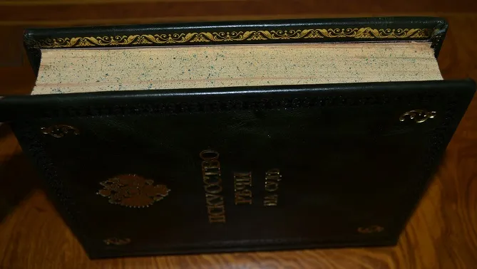 Сохранность - очень хорошая! Роскошный коллекционный экземпляр с сохранением издательских обложек переплета! В цельном кожаном переплете /высококачественная переплетная кожа, ручная работа!/, с богатым золотым, и конгревным /глубоким!/ тиснением, и в бархатном стилизованном футляре с золотым тиснением! Художественное оформление переплета, увеличен. /энциклоп.!/ формат: 20,5 х 16,5см., 390с., составные цветные форзацы, золотые дублюры, тонированный обрез! Комплектное коллекционное издание!