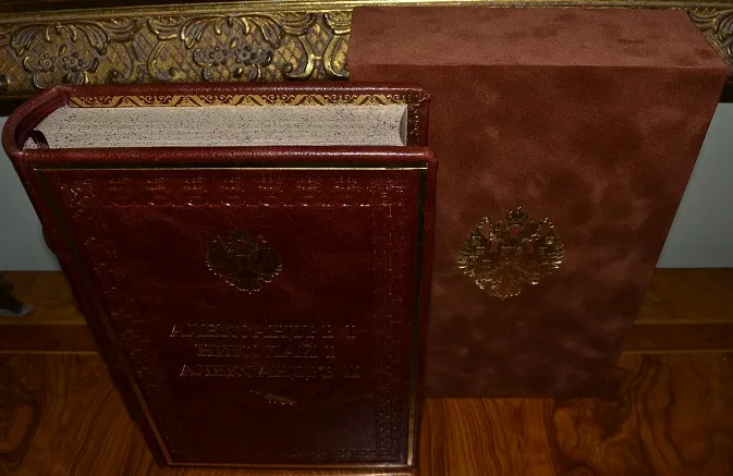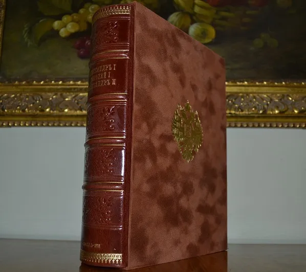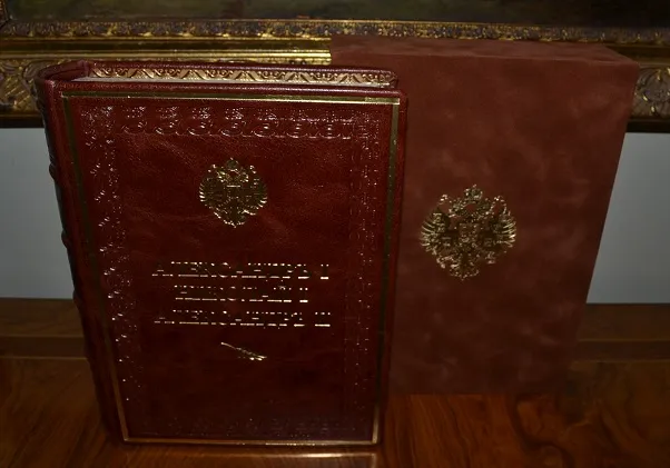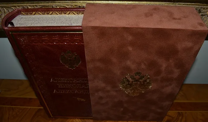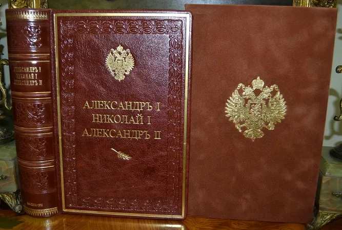Сохранность - очень хорошая! Прекрасный коллекционный экземпляр с сохранением всех издат. обложек! В роскошном, подарочном цельном кожаном переплете /высококачественная переплетная кожа, ручная работа!/, с богатым золотым и конгревным /глубоким!/ тиснением, стилизованное оформление /герб России и художественный орнамент!/, и в бархатном футляре с золотым тиснением большого герба России! Увеличенный /энцикл.!/ формат: 25 х 17см., цветные составные /художественные с гербами!/ форзацы с золотой дублюрой, богато украшенный бинтовой корешок, шелковое ляссе, 157+187с.+180с., тонированный обрез блока! В издании представлены многочисленные иллюстрации на отд. листах, фототипии, портреты и т.п., дополнено и украшено изысканными зарисовками, концовками, стилизованными заставками, виньетками и пр.! Отпечатано издание на плотной мелованной бумаге! Комплектное коллекционное издание - прекрасный подарочный вариант!