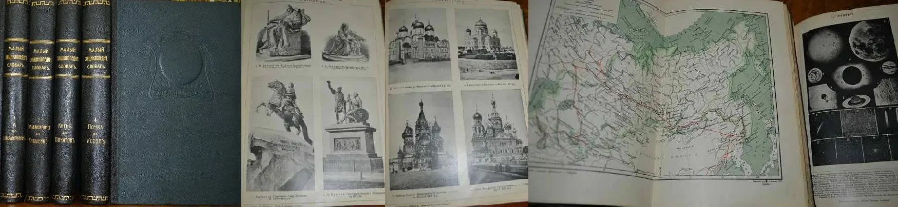 В 1899-1902 годах впервые выходил «Малый энциклопедический словарь Брокгауза и Ефрона» (в 3-х томах), переизданный в 1907-1909гг. в значительно дополненном виде (в 4-х томах). Под редакцией М.М.Марголина. Словарь представляет собой внушительную подборку статей из 86 томов большого словаря Брокгауза. Это универсальное справочное издание по всем отраслям знаний! Отдельно представлено богатое описание России во всем ее многообразии науки, истории, культуры, политики, географии, от древней истории до XIX века выделено отдельными разделами!