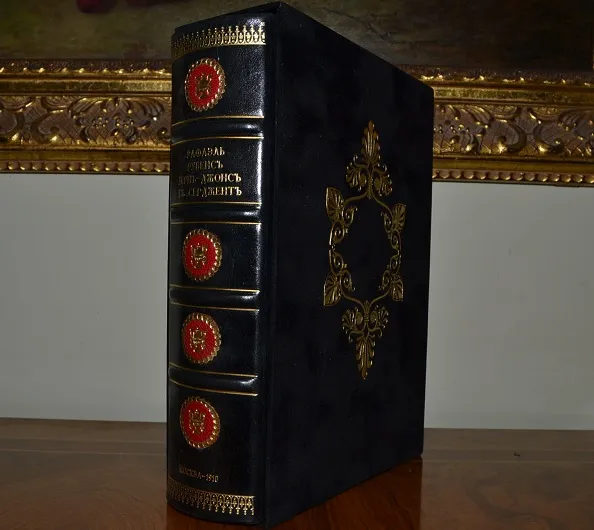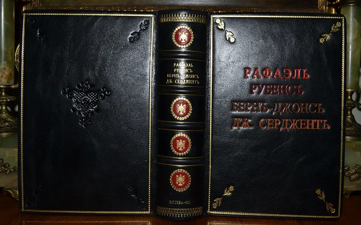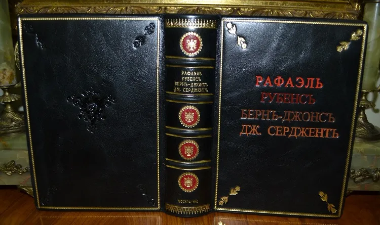 Сохранность - очень хорошая! Коллекционный экземпляр в роскошном цельном кожаном переплете, с сохранением всех худож. издат. обложек /высококачественная переплетная кожа, ручная работа, художественное оформление!/, с богатым золотым, цветным и конгревным /глубоким!/ тиснением, и в стилизованном футляре с золотым тиснением! Формат: 20 х 16см., цветные составные форзацы, золотая дублюра, цветной орнаментальный обрез блока, шелковое ляссе, 79с+80с+80с+79с. В издании представлены многочисленные цветные иллюстрации на отд. листах, рисунки в тексте, портреты и пр.Издание отпечатано на плотной /вержированной и мелованной!/ бумаге! Комплектное коллекционное издание!