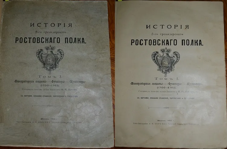 3. История 2-го гренадерского Ростовского полка. Попов. Н. Н., капитан, офицер полка. Планировалось- Четыре тома: т. I-й: 1700—1762 г.г., Издан только том I-й. Москва. 1902 г. 8°, XX+414+194 стр. 600 экз. Цена 8 руб.