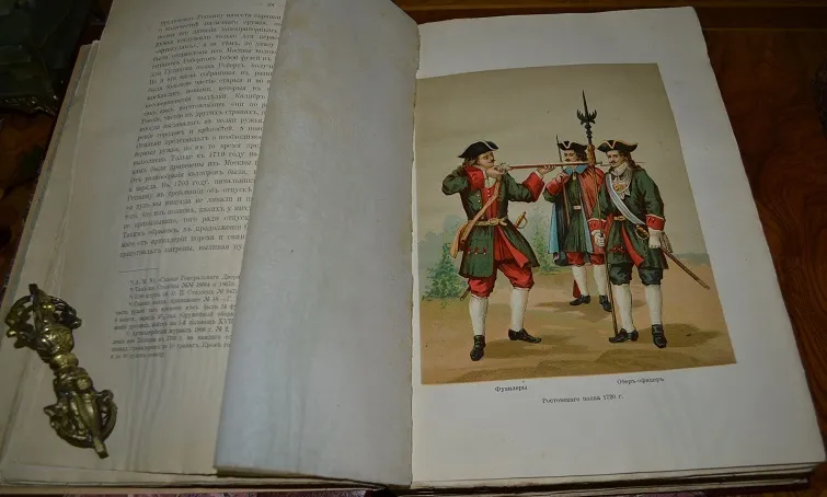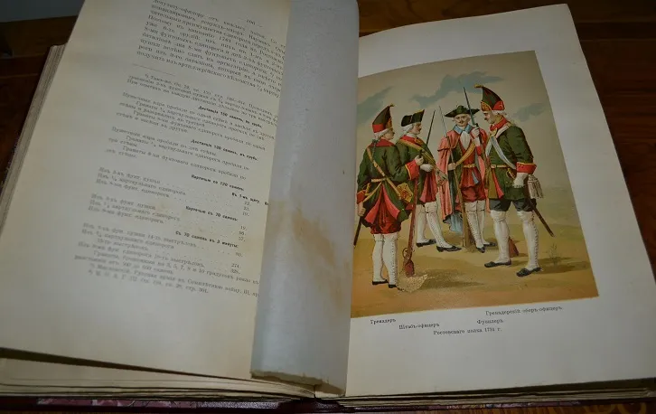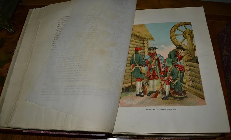 Сохранность - хорошая. в п.к перелете с сохранением изд. обложки. С карт., пл. сражений, портр. и рис. / Сост. того же полка кап. Н. Н. Попов: Т.1 [и единств.]. М.: Типо-лит. А. П. Коркина, 1902. — Т.1: «Новоприборные солдаты» — «Фузилеры» — «Мушкетеры» (1700-1762). XX, 414, [2], 194 с.: 24 л. ил., портр., план.; 29,4х21 см. — 600 экз. Часть иллюстраций с изображением форм обмундирований за 1700-1731 гг. 4 иллюстр. выполнена в технике хромолитографии.
