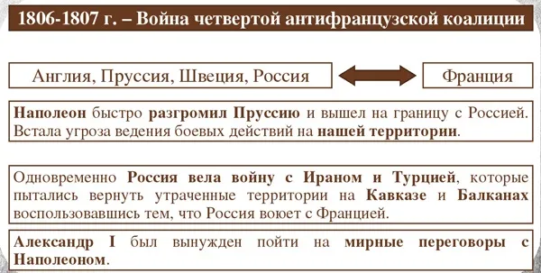 Не дожидаясь подхода русских войск, пруссаки начали военные действия против Великой армии Наполеона I и потерпели сокрушительное поражение 14 октября 1806 года в сражениях при Йене и Ауэрштедте. За шесть недель французами практически без сопротивления была занята почти вся Пруссия, взяты Берлин и Варшава. Русские войска встретили продвигавшиеся французские части в Польше и Восточной Пруссии. Последовали сражения при Пултуске и Голымине. 26 января 1807 года русская армия под командованием генерала от кавалерии Л.Л. Беннигсена дала решительный бой французам при Прейсиш-Эйлау, который не выявил победителя, как и сражение 24 мая при Гуттштадте. 29 мая у Гейльсберга русская армия успешно отразила наступление наполеоновских войск, но 2 июня во Фридландском сражении из-за ошибок Беннигсена потерпела поражение и отошли за реку Неман. Война закончилась подписанием мира в Тильзите 25 июня.