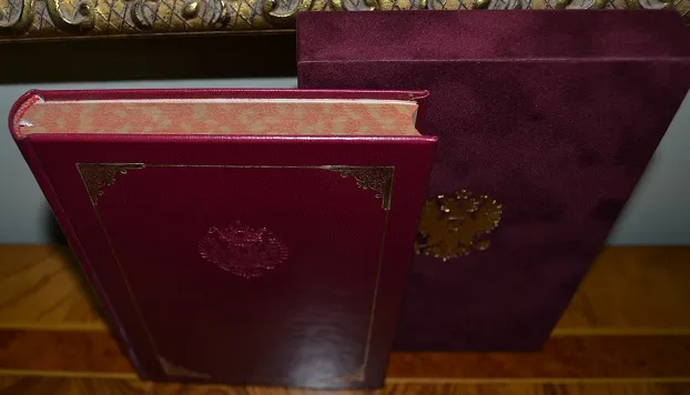Сохранность - очень хорошая! В ледериновом переплете с золотым и конгревным тиснением, и в бархатном стилизованном футляре с золотым тиснением герба России! Стандартный формат 21,5 х 14,5см., 318с., цветной орнамент. обрез блока! Редкое комплектное /не зачитанное!/ издание!