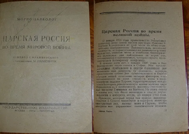 Выполненные в форме дневниковых записей (с 20 июля 1914г. по 17 мая 1917г.) мемуары карьерного дипломата – школьного друга президента Р. Пуанкаре и бывшего посла Французской Республики в Российской империи Мориса Палеолога в свое время, в начале 20-х годов, вызвали на Западе настоящую сенсацию и вскоре были переведены на ряд языков, в том числе на русский! Однако оценки, дававшиеся в те годы работам «классовых врагов» и заключавшиеся в том, что для истинных коммунистов эти книги – заведомая ложь и потому не представляют собой ценности, со временем показали истинное лицо и ответили на многие исторические загадки. В этом издании Палеолог писал .."Не является, ли Ленин, немецким провокатором!?" Но, примечательно то, что издание вышло при жизни В.И.Ленина и тем не менее не подверглось цензуре!