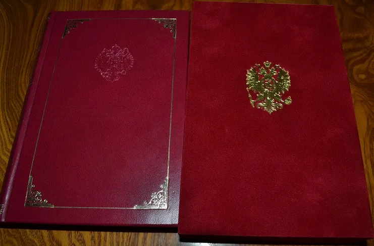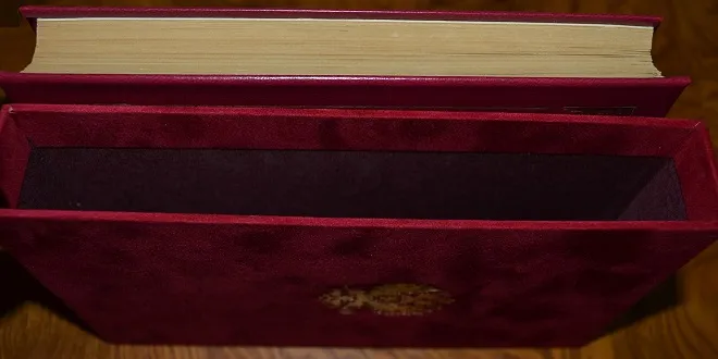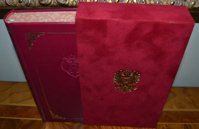 Сохранность - очень хорошая! В ледериновом переплете с золотым и конгревным тиснением, и в бархатном стилизованном футляре с золотым тиснением герба России! Стандартный формат 21,5 х 14,5см., 418с., цветной орнамент. обрез блока! Редкое комплектное /не зачитанное!/ издание!