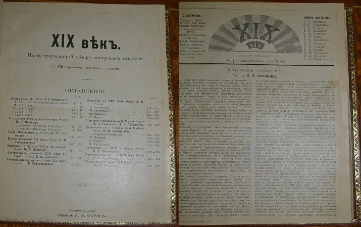 Из Оглавления: "Мировые события" Л.З.Слонимский, "Пятьдесят лет русской истории" Н.К.Шильдер, "Царь-Освободитель" А.А.Шумахер, "Россия накануне XX века" Р.И.Сементковский, "Вооруженные силы" В.И.Недзвецкий, "Изящная литература на Западе" П.И.Вейнберг, "Литературное движение в России" Е.А.Соловьев, "Русская литература накануне XX века" Р.И.Сементковский, "Искусство" В.В.Стасов, "Народное образование" В.А.Гольцев и Д.И.Тихомиров, "Естествознание и техника" М.Ю.Гольдштейн, "Астрономия" К.Д.Покровский.