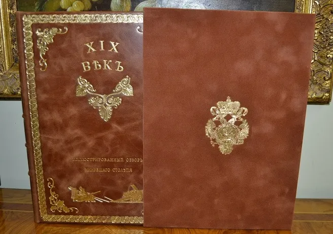 Сохранность - очень хорошая! Подарочный вариант исполнения - в цельном кожаном переплете /высококачественная переплетная кожа, ручная работа, роскошный французский переплет!/, богатое золотое и конгревное /глубокое, художественное!/ тиснение, и в стилизованном бархатном коробе с золотым богатым тиснением! Альбомный /увеличен.!/ формат: 33 х 24 см., 406с.! Цветные /художественные!/ форзацы с золотым тиснением гербов России/!/, золотая дублюра, бинтовой корешок, тонированный обрез блока, шелковое ляссе!